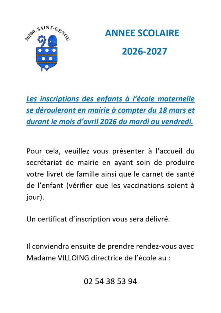 By saintgenou|2026-03-05T10:21:54+01:00mars 14th, 2025|Non classé|Commentaires fermés sur INSCRIPTIONS SCOLAIRES 2026-2027