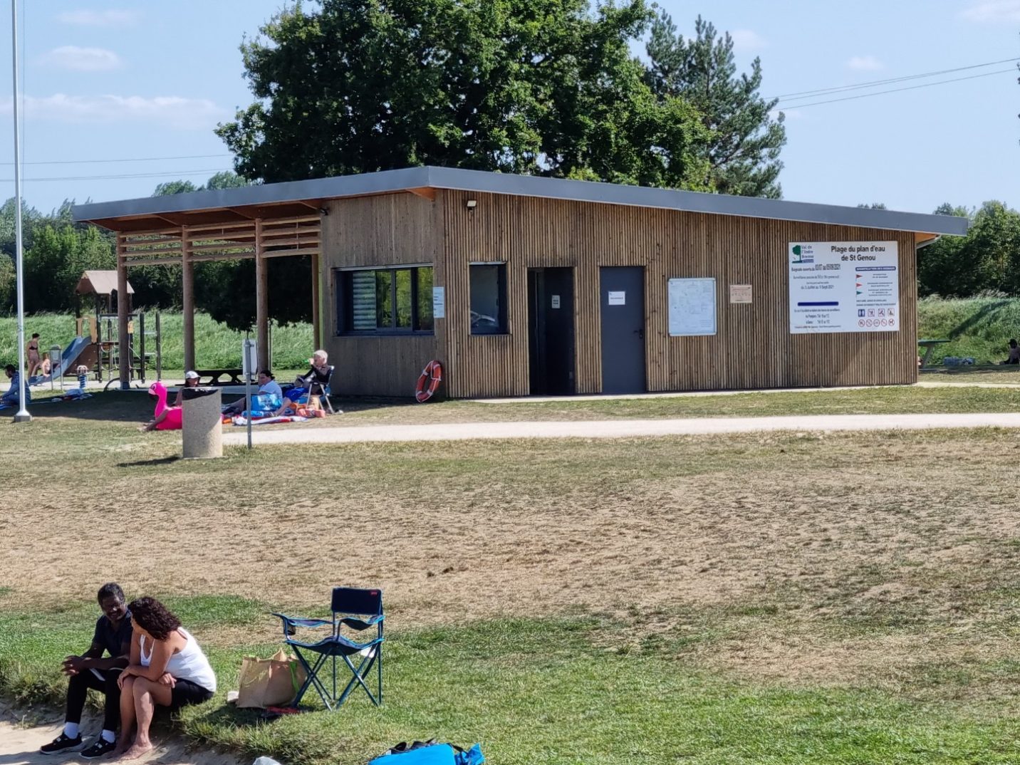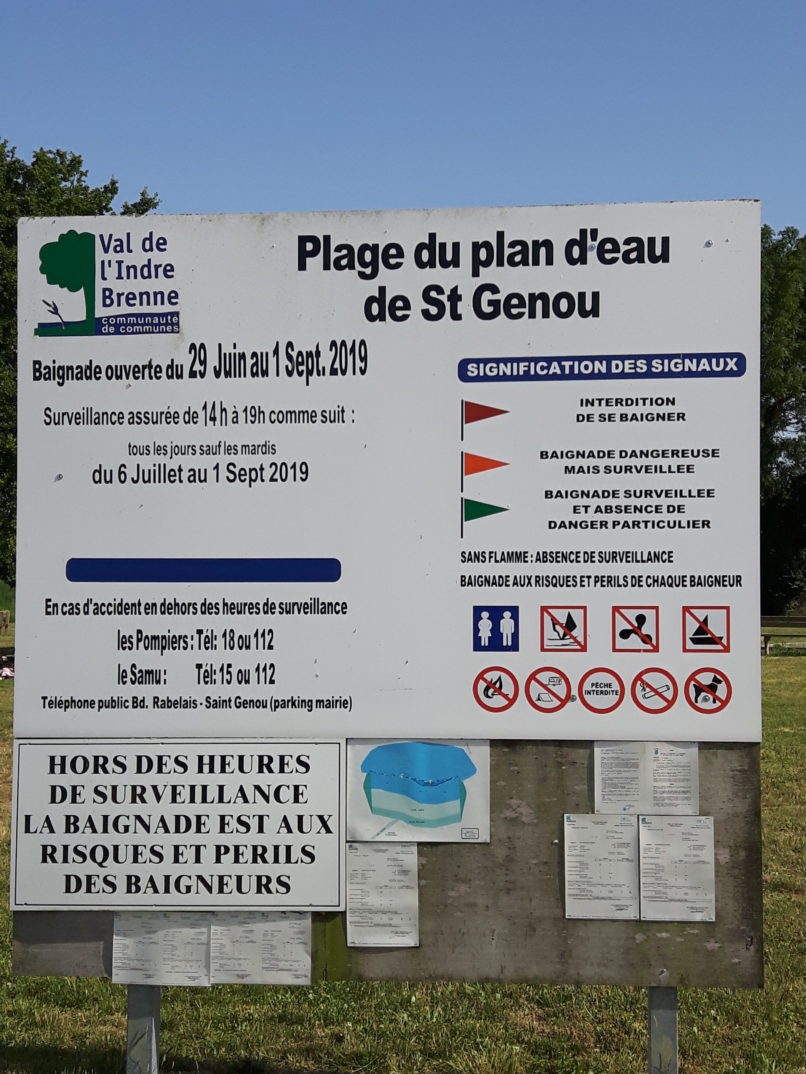 Espace de 120 m de baignade dont la profondeur atteint 1,20 m. Des analyses sont faites régulièrement. La plage de Saint-Genou est équipée d’un poste de secours/sanitaires/buvette/restauration, de tables de pique-nique et d’un parking ombragé. La surface plage en herbe est de 2.000 m² - la surface de la plage en sable est de 1.800 m² et la surface de la zone de baignade est de 3.200 m².