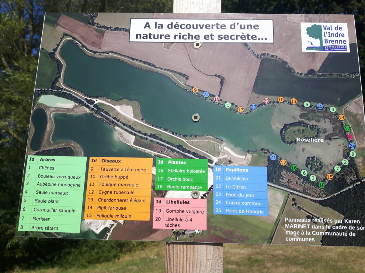 Le parcours “découverte” débute à droite de la plage, tout au long du chemin en bordure du plan d’eau. Faune et flore peuplant cet espace protégé y ont été répertoriés par Karen Marinet lors d’un stage à la Communauté de Communes.